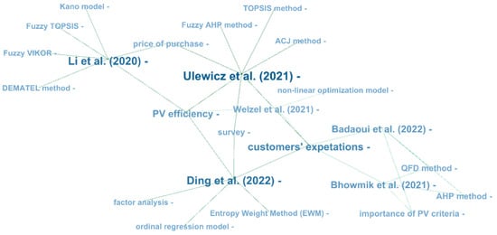 After the literature review, it was shown that analyses of using RES (mainly PV) were performed considering that the expectations were realized, for example, [24,25,26]. They were based, for example, on efficiency, price, or application possibilities [27,28,29,30]. Studies were created in which the selection of a product or predicting the direction of improvement would mainly take into account individual customer requirements and expert opinion [6,31], real parameters of product criteria [32,33,34], criterion of impact on natural environmental [33,35,36,37], or price of purchase [4,6,38,39,40]. Furthermore, MCDM (multiple-criteria decision methods) were also used, i.e., DEMATEL method, EWM method, AHP method, fuzzy AHP method, fuzzy VIKOR, and TOPSIS method. In these works, the indicated aspects appeared, but no work was found that simultaneously considered all of them in a combined manner and supported by an appropriate method, such as the example using criteria for selected works, shown in Table 1.