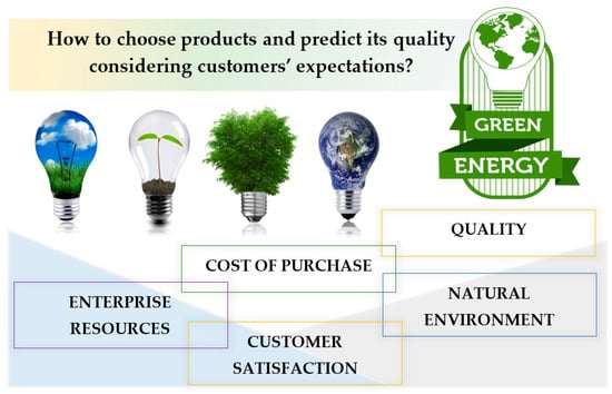 Nevertheless, these works did not constitute a single, coherent study; i.e., the key criteria for analyzing the quality level of the product were not used in a simultaneous and combined way. Furthermore, the environmental influence in the other key criteria was not included. This was considered a gap that was assumed to be filled. In a new proposed model, we will integrate these key criteria, i.e., individual customer expectations, price of purchase, efficiency (based on the actual parameters of criteria), criterion of environmental influence, and importance (weight) of criteria.
