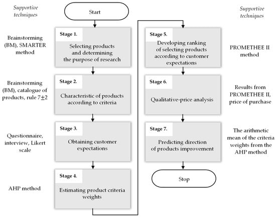 In the model, and integrated in a sequential way, the selected instruments support the decision making and assessment of product quality. These techniques are as follows: brainstorming (BM) [41], SMARTER method [42], rule 7 ± 2 [31,33,43], a questionnaire with the Likert scale [44], AHP method [45,46,47], and PROMETHEE II method [48,49]. The analysis was also supported by the actual purchase price of the product in a matrix data analysis dedicated to this model [6,37].