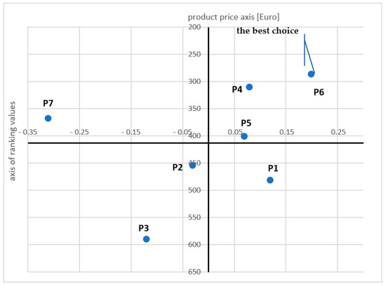 Moreover, the PROMETHEE II method is used to develop a ranking of choice. Its choice is conditioned by the possibility of calculation by real data and also eventually including data obtained in a qualitative (description) way. Additionally, in this method, the analysis is performed considering the importance of criteria [45,46,49]. As a result, a product-selection ranking is created, which concerns the quality of products according to the fulfilment of customer expectations. The qualitative price analysis is realized by using matrix data analysis [37], which shows which product is the most favorable for quality, impact on the environment, and price of purchase.
