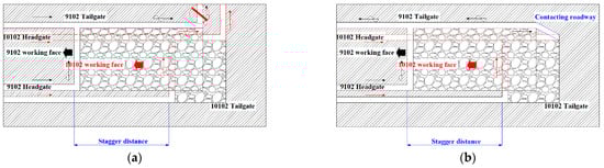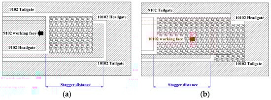 Relationship between goaf of upper and lower coal mining faces and gob-side entry. (a) 9102 working face location (b) 10102 working face location.