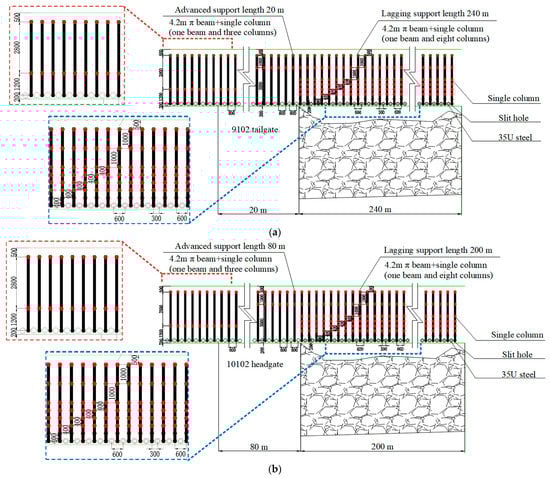 Advance support and lagging support gob-side entry. (a) 9102 tailgate advance support and lagging support gob-side entry (b) 10102 headgate advance support and lagging support gob-side entry.