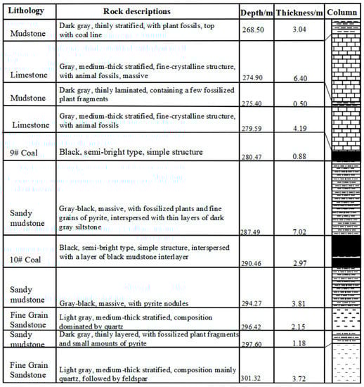 The lithology of the roof and floor of 9102 and 10102 working faces is shown in Figure 4. The thickness of the No. 9 coal seam is 0.30 m to 1.75 m, averaging 1.04 m, with a simple structure, generally containing 0 to 1 layer of gangue, and is a stable and mostly mineable coal seam in the whole area. The roof is L1 limestone, and the floor is mudstone and sandy mudstone. The thickness of the No. 10 coal seam is 1.74 m~3.93 m, with an average of 3.04 m, and a simple structure containing 1~3 layers of gangue, stable thickness, and is mineable across the whole area.