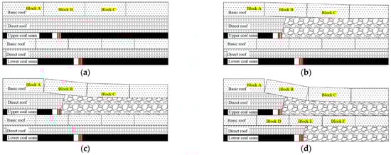 Finally, when the subsidence of the goaf roof in the upper group of coal seams falls within the range of , block B experiences sliding instability. When , block B will rotate and deform, and both situations will cause severe mining pressure in the roadway, leading to large deformation of the surrounding rock and posing a threat to the stability of the next group of coal seam roadways and the safety of mining work. Therefore, in the mining of the lower group of coal seams, it is necessary to further consider the reasonable stagger distance between the upper and lower working faces to reduce the stress concentration caused by the mining impact of the upper group of coal seams.
