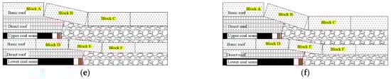 The process of roof failure during mining at the working face. (a) End of upper and lower roadway excavation (b) Start of upper group coal seam mining (c) End of upper and lower roadway excavation (d) Start of upper group coal seam mining (e) End of upper and lower roadway excavation (f) Start of upper group coal seam mining.