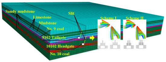 Combined with the lithology, spatial distribution, and the mining scheme of the 9102 and 10102 chutes of the Jiaokou coal mine, a numerical model of 335 m × 320 m × 50 m was established (see Figure 7), taking into account parameters such as the size of the coal roadway, the width of the working face, and the horizontal and vertical distances. The rock mechanics parameters (see Table 2) and contact parameters (see Table 3) were defined, and the boundary conditions were set after pre-splitting. Pre-splitting and roof cutting are achieved by using the interface unit in FLAC3D to define the cracking behavior. The model contains two support schemes, scheme I and scheme II, which adopt different anchor spacing, row spacing, and number of anchors, respectively. For scheme I, anchor spacing is 1100 mm, row spacing is 1600 mm, it has one anchor cable in the center of the roof, and 3 and 4 anchor cables in the 9102 return wind chute and 10102 transport chute of the roadway gang, respectively. For scheme II, two anchor cables are added on the basis of scheme I, the distance between its anchors is 700 mm, and the distance between its rows is 800 mm. After adding support, the coal seams 9 and 10 were excavated in steps, and the changes in the surrounding rock stresses in the two roadways during the retrieval process were studied.