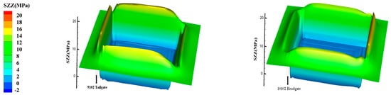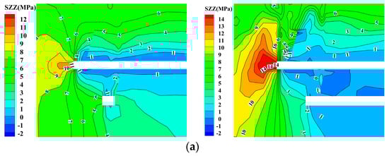 In Figure 9, the stress magnitude along the slit side of the gob-side entry is compared and analyzed with the back of the mining area. In Figure 9a, the stresses on the solid coal side with a slit are larger compared with the stress values on the uncut side. This indicates that the bending and sinking of the upper mining area during the lower group of coal seam retrieval makes the solid coal side with cut seams suffer greater support stresses. The reason for this phenomenon is that the overburden activity in the lower mining area leads to an increase in the overburden activity space in the mining area of the upper coal seam. In this case, the overburden in the upper mining area will continue to sink, destroying the stability of the original articulated structure. As the overburden in the upper mining area rotates and slips, the stress will be redistributed and reach a new equilibrium state, resulting in differences in stress values. The overburden activity weaken the regulating effect of upper group coal seam cuttings on stress distribution, which increases the supporting stress on the solid coal side.