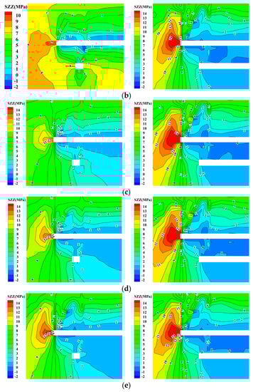 In Figure 8, contour lines are drawn for the stress distribution of the upper and lower group coal seam along the gob-side entry at the different working face stagger distances. According to Figure 8a–e, it is known that the stress value of the lower group of coal roadways is smaller than that of the upper group of coal roadways. It can be seen that the upper group coal seam roof cut destroys the roof stress transfer, and with the stagger distance increase in the working face’s advance, the stress on the solid coal side and the roof increases, and the roadway gang is always in a high-stress state. However, when the working face stagger distance is 40 m, see Figure 8b, the stress of the upper coal seam gob-side entry solid coal side is 9 MPa, the stress of the lower coal seam gob-side entry solid coal side is 8 MPa, the difference between the two is not significant. This indicates that the mining activity of the upper coal seam face has the greatest impact on the lower part at this time. When the working face is staggered by 20 m, the roof of the upper coal seam working face has not yet fully collapsed. For the safety and efficiency of mining the lower coal seam, we believe that the suitable working face offset is 40 m.