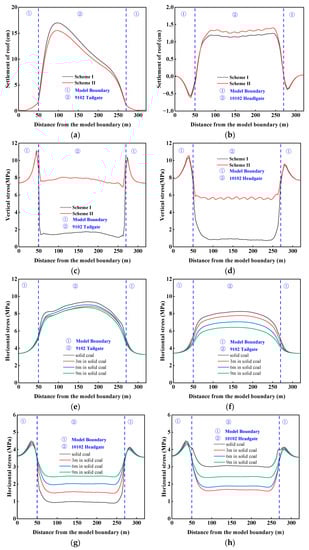 Comparison of support schemes. (a) 9102 tailgate roof settlement (b) 10102 headgate roof settlement (c) 9102 tailgate roof vertical stress (d) 10102 headgate roof vertical stress (e) Stress on solid coal side of 9102 tailgate in scheme I (f) Stress on solid coal side of 9102 tailgate in scheme II (g) Solid coal side stress of 10102 headgate in scheme I (h) Solid coal side stress of 10102 headgate in scheme II.