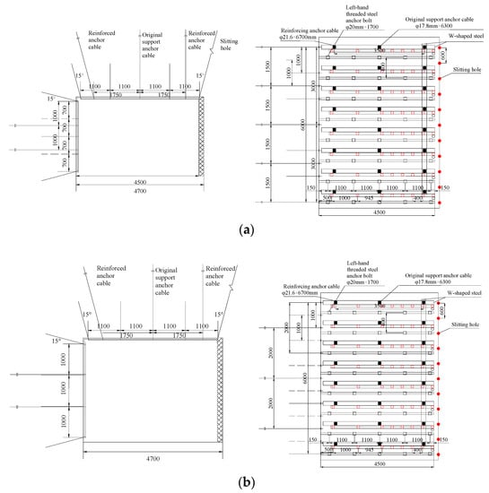 The 9102 tailgate and the 10102 headgate are both rectangular in the cross section, with dimensions of 4700 mm × 3000 mm and 4700 mm × 3500 mm, and the 9102 tailgate is cut into the bottom of the coal seam, while the 10102 headgate is cut along the top of the bottom. The cross section and plan of the gob-side entry roof reinforcement support are shown in Figure 11.
