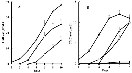 Induction of Trametes gibbosa (A) and Piptoporus betulinus (B) endoglucanase synthesis. T. gibbosa was grown in media containing 1% Avicel (■), 0.5% glycerol (♦), 0.5% glycerol + 1% Avicel (◊), 0.5% glycerol + 1% Avicel on day 4 (∆). P. betulinus was grown in media containing 1% cellobiose (■), 0.5% glycerol (♦), 0.5% glycerol + 1% cellobiose (◊), 0.5% glycerol + 1% cellobiose on day 3 (∆).