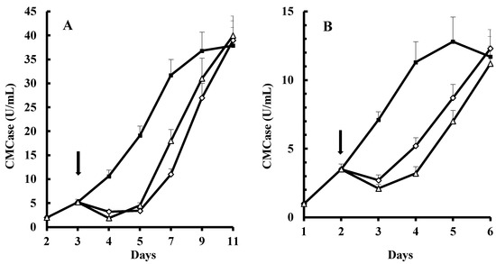 Catabolite repression of T. gibbosa (A) and P. betulinus (B) endoglucanase synthesis. T. gibbosa was grown in media containing 1% Avicel (■), 1% Avicel + 0.4% glycerol on day 3 (◊), and 1% Avicel + 0.4% glucose (∆) on day 3. Arrow indicates the day of glucose or glycerol addition. P. betulinus was grown in media containing 1% cellobiose (■), 1% cellobiose + 0.2% glycerol on day 2 (◊), and 1% cellobiose + 0.4% glycerol (∆) on day 2. Arrow indicates the day of glucose or glycerol addition.