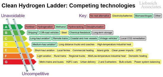 Different uses of clean hydrogen; A-B hydrogen cleanness scale—A-very clean, environmental neutral, G-potentially harmful to the environment; *—Via ammonia or e-fuel rather than H2 gas or liquid [21].