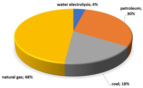 Currently, 48% of the produced hydrogen is produced as a result of the reforming of methane using steam, 30% from crude oil (mainly in refineries), 18% from coal and the remaining 4% from water electrolysis. The majority of hydrogen produced today is the so-called “Gray hydrogen”, which currently dominates the market. It is obtained from fossil fuels, primarily from natural gas and coal. Natural gas is converted into hydrogen and carbon dioxide under heat in what is known as steam reforming. CO2 escapes unused into the atmosphere and, thus, increases the greenhouse effect. Depending on the source and the mix of electricity, the production of one tonne of hydrogen generates around ten tonnes of CO2—a considerable amount [22,30].