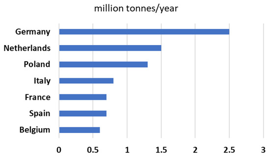 Currently, the demand for lithium in the European Union is about 6000 t of lithium per year, but by 2030, it is expected to increase by 108,000 t (18 times), while in 2050, the demand for this element is expected to be 360,000 t, that is, 60 times the consumption in 2020 [42].
