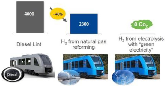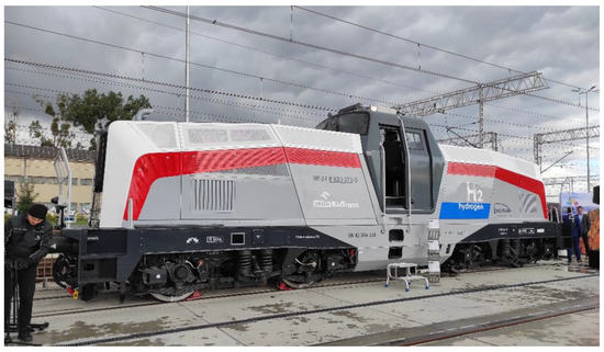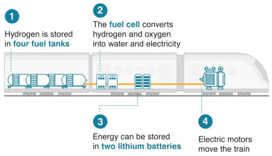 Nowadays, the hydrogen drive in trains is implemented according to the scheme hydrogen cells—accumulator battery—electric motors (Figure 10).