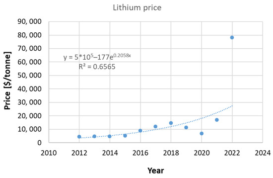 Lithi um prices per tonne, 2012–2022 (based on World of Statistics, [49]).