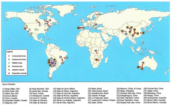 Distribution of the major lithium mineral deposits in the world [44,50].