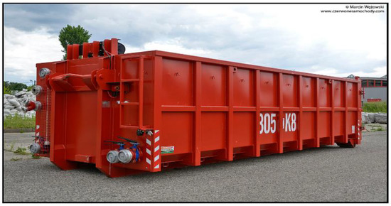 The factor that causes ignition is lithium or, more precisely, a gas that is released when the liquid (battery electrolyte) reacts with lithium. The problem with extinguishing it is that the batteries are sealed in housings so that no external medium enters the battery or flows out from inside the battery. For this reason, during an electric car firefighting operation, the main goal is to cool it down, which requires huge amounts of water. In some countries, special extinguishing containers are used during the firefighting operation of electric or hybrid vehicles (Figure 14) [55].