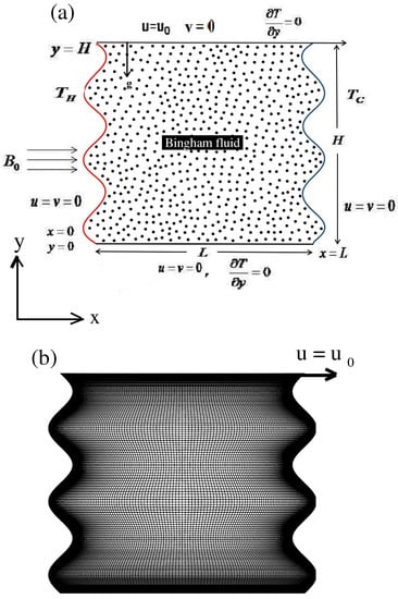 The schematic diagram with the coordinate system and mesh composition is shown in Figure 1, where Figure 1a shows the model geometry with coordinate system, and Figure 1b shows the mesh distribution of the system. A laminar fluid flow in a chamber is characterized as incompressible with the Boussinesq approximation. A horizontal magnetic field is applied to the flow. The Bingham non-Newtonian AlO–water nanofluid is assumed to be in the enclosure. Furthermore, it is assumed that the base fluid and solid nanoparticles are flowing at thermal equilibrium and at the same velocity. The vertically heated left wavy wall contributes to the heat transmission process in the square chamber. In Figure 1a, it is shown that the top (driven wall) wall maintains an initial velocity of . When it comes to the heated and cold walls, there is a difference between the left vertical wall’s and the right wall’s (). According to the Figure 1b, the mesh composition is densely distributed near the walls and sparsely distributed in the middle of the enclosure. The enclosure’s wavy left and right walls can be expressed as follows: