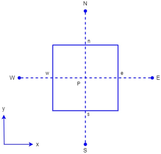 The governing equations are transformed into the Cartesian coordinates to handle the complex wavy enclosure to a simple square computational domain. The final equations are discretized by the finite volume method (FVM) with a collocated grid system. Grid generation is the crucial step of any numerical method such as FVM. It is a discrete implementation of the computational domain, and the problem is solved based on this domain [55]. This creates limited control volumes (CV) within the field. Each CV for the 2D problem represents a cell with four faces. Figure 2 represents a computational node of a central CV, whose center is at P. E, W, N, and S are the centers of its neighboring CVs. The central CV’s four cells are denoted by e, w, n, and s. The variables’ values at the cell faces are calculated via interpolation based on the node points. The surface and volume integrals are assessed using the suitable quadrature formula to produce an algebraic equation for each CV. The numerical methodology is described in excellent detail in [72]. In this study, the FORTRAN code is updated to solve the governing equations indicated above [73,74,75]. The code is double precision, entirely implicit, and second-order precise in both space and time. The SIMPLE algorithm has been used in conjunction with a colocated grid arrangement of the variables and a time-marching pressure-correction approach.
