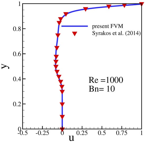 Figure 3 shows the u-velocity comparison of the current study with Syrakos et al. [35]. The outcome of this comparison is depicted in Figure 3. The consistency with the results of Syrakos et al. [35] is good in the instance of and .