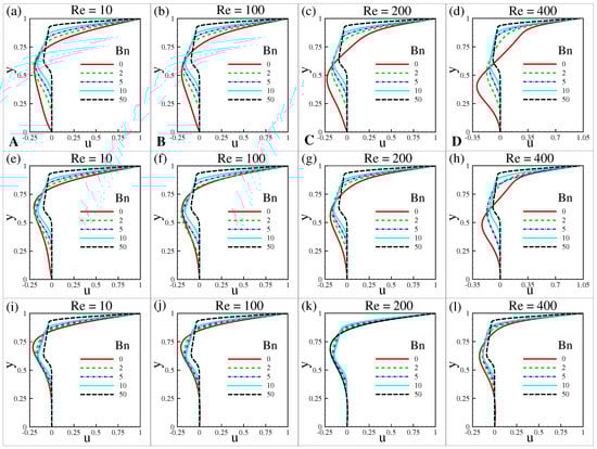 u-Velocity distributions for various when (A) , (B) , (C) , (D) , and (a–d) , (e–h) and (i–l) while .