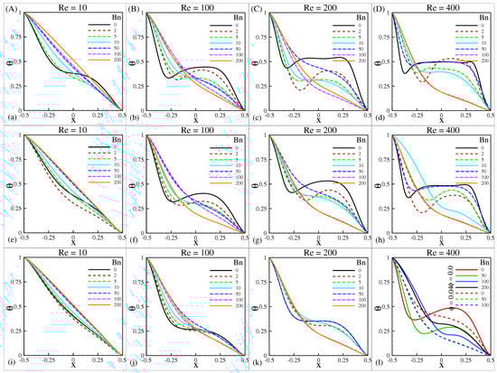 Temperature distributions for various when (A) , (B) , (C) , (D) and Hartmann number (a–d) , (e–h) and (i–l) while .