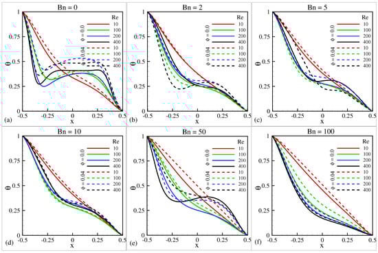 Moreover, Figure 6 shows that as grows, the temperature distribution becomes linear due to its high viscosity. That means increasing increases the viscosity of the fluid, which opposes the fluid flow, and that is why the change in becomes linear as grows. As a result, the overall temperature of the system decreases as increases. From Figure 6a–f, it can be seen that is higher for the higher values of and . The increment happens due to the inertia force and nanoparticles effect. However, overall, also increases as increases. Adding of nanoparticles accelerates the temperature distribution process.