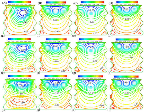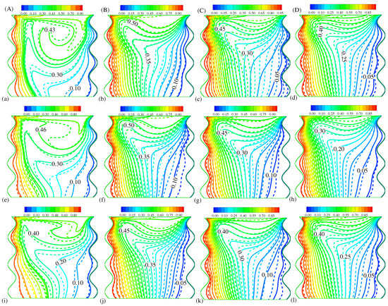 Streamlines for (A) (B) (C) (D) , and (a–d) , (e–h) and (i–l) while , and .