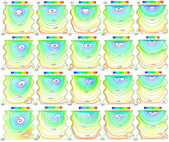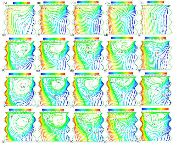 Streamlines (A) (B) , (C) , (D) , and (E) ; where (a–e) , (f–j) , (k–o) , and (p–t) , while (), and .