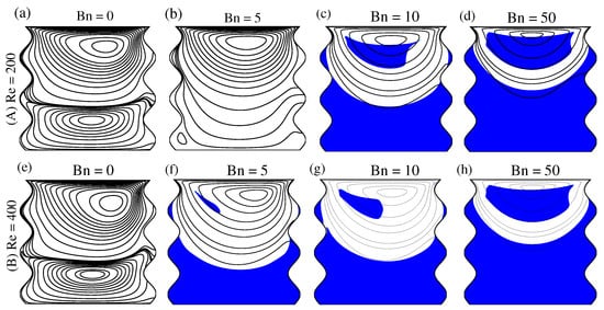The Bingham number () is the yield stress ratio to viscous stress. Yield stress usually slows down the flow. Figure 4 shows the dimensionless axial velocity for flow with different and at and 400. The presence of wavy walls and a temperature differential excite the flow domain and induce movement inside the cavity. The flow direction is clockwise and always complies with the produced buoyancy force. At , the high-velocity component is owing to the delivered inertia from the surface to the flow, which causes large axial velocity. When an object experiences a force, the item accelerates, which in turn has an impact on its velocity. The inertia force and velocity have a proportionate connection. An increased results in increased fluid momentum depletion and lower resistance near the fluid path. The impact of forced fluid movement in layers away from hot and cold sources is mitigated by lowering the fluid penetrability. A high also contributes to greater flow velocities within the cavity. Circulation in a cavity with a higher and a lower near the walls produces stronger velocity parameters; however, as you approach the cavity’s center, the fluid velocity has become negligible caused by a change in the liquid direction, and the same thing happens in the upper half of the cavity. Adding decreases the u-velocity in the cavity, because increases in improve the Lorenz force, resulting in a reduction in velocity distributions. As the rises, the amplitude of the highest horizontal velocity decreases.