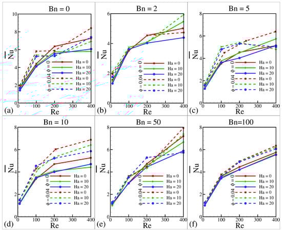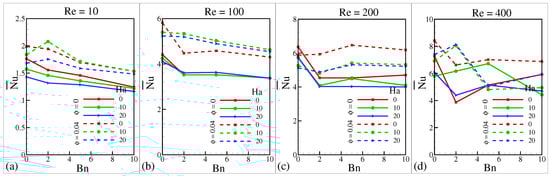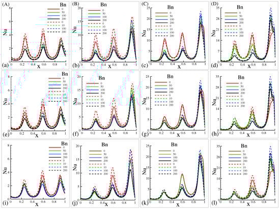 Figure 8 illustrates the streamlines for various , , and to provide a more thorough picture of flow and heat transmission in a wavy square cavity. A magnetic field has been applied parallel to the x-axis. When the magnetic field is zero ( = 0), a clockwise revolving vortex with its center toward the right upper of the chamber has been discovered. The influence of mixed convection on the fluid flow and the associated heat transfer at various is discussed here. The streamlines of a fluid flow are affected by the Bingham number, especially in areas with high shear stresses. When a threshold stress is achieved in a fluid flow with a high Bn number, the fluid first behaves like a solid or exhibits strong resistance to deformation before starting to flow. The fluid’s velocity field becomes complicated as a result of this behavior. According to the data, the flow phenomenon consists of one primary vortex on the central top of the cavity for . When and are increased, a secondary vortex appears at the bottom right corner. A further increment in results in two independent cells that separate the cavity into two different chambers due to the magnetic field and buoyancy effect. The additional chamber found is a direct result of the shear force. At , secondary vortices with opposing, rotations may be seen toward the left bottom end of the chamber. The pattern is the same regardless of fluid type for various except at . The number of these cells is insignificant compared to the significant circulation cells. Forced convection is attempted to be balanced by a strong magnetic field. The stream function’s value drops as the increases. The weak convective flow in the cavity results from a greater magnetic field, which in turn causes a higher Lorentz force inside the fluid domain when the values are increased.