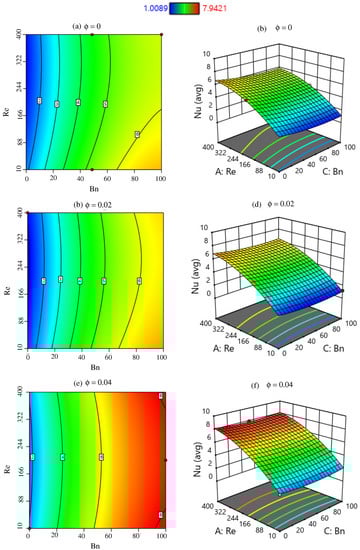 The impacts of , , and on isotherms are presented in Figure 9. In many flow field scenarios, aids in the prediction of flow patterns. When convection significantly contributes to heat transport, the isotherms become more curved as rises. In the scenario of and at , it can be seen that the isotherms for Bingham fluids are parallel to the vertical walls, but the isotherms for Newtonian fluid flow () are curved. Due to larger viscous effects in the Bingham fluid at the same nominal value of , this difference effectively indicates that the at which convection effects are felt is greater for Bingham fluids than for Newtonian fluids. Flows with low are likely to be laminar, whereas those with high are likely to be chaotic. Chaotic flow is caused by changes in the fluid’s direction and speed, which can occasionally cross or even travel in the opposite direction of the flow’s main direction. Chaotic flow takes place at high () and therefore is dominated by inertial forces, which tend to produce chaotic eddies, vortices, and other flow instabilities; laminar flow occurs at low () and is characterized by smooth, constant fluid motion. Temperature graphs show that adding solid nanoparticles to the base fluid increases the nanofluid’s thermal conductivity parameter and results in a more even distribution of temperature inside the chamber. The left side wall is where isotherms are concentrated, indicating the location of the quickest fluid movement. Away from the top wall, isotherms are more widely distributed.