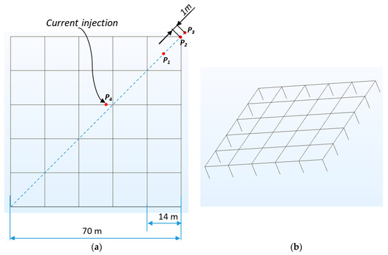 Before using the general FEM software Comsol Multiphysics® to model the proposed ECON-EE grounding system, it was decided to validate its capacity to model a conventional SGS. For this, an SGS model extracted from an earthing benchmark study proposed by [28] was used. The grounding grid presents square dimensions of 70 m × 70 m (Figure 1a), buried at 0.5 m in the ground, constructed with a copper conductor of 9.27 mm diameter (2/0 Cu) and symmetrically spaced at 14 m in each direction. The use of vertical rods 7.5 m in length and 15.9 mm in diameter, located at each conductor intersection around the grid perimeter (for a total of 20 rods), was also studied (Figure 1b).