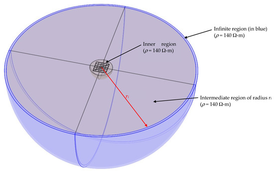 Figure 2 presents the FEM model of the grounding grid without rods and with a uniform soil model, whereas Figure 3 presents the FEM model with vertical rods and a two-layer soil model. As described in Figure 2, the soil is divided into three semi-hemispherical regions with the same electrical properties but with different finite element sizes and properties. The inner region, with a fixed radius of 60 m surrounding the grid, uses the finer mesh size to match the mesh size used for the grid, as illustrated in Figure 4. The intermediate region of radius ri also uses finite elements but with a larger size than the inner region. Finally, the outer region of 10 m width contains infinite elements available in Comsol Multiphysics® [29]. All the simulations in this paper were performed under stationary conditions.