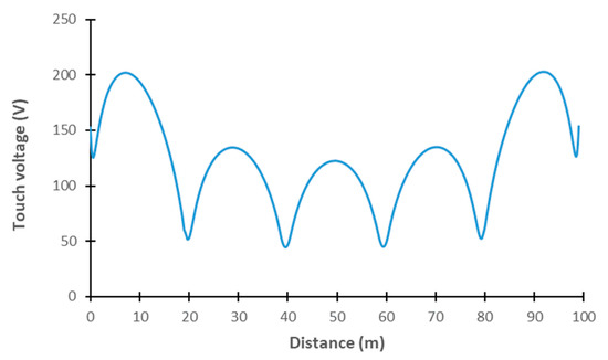 Figure 4 presents an example of the distribution of the equipotential lines of the touch voltage obtained from Equation (4) for the grid without vertical rods and using a uniform soil model; Figure 5 presents the corresponding distribution of the touch voltage along the diagonal of the grid. As can be observed, the distribution of the touch voltage is quite symmetrical at the surface of the grid. The maximum values of the touch voltage distribution are obtained close to the center of each grid mesh and the minimum values are above the electrode intersections.