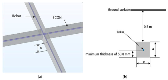 Figure 6a presents an overview of the ECON-EE grounding model and Figure 6b a view of the ECON-EE section parameters. As can be observed, the rebar grid (in blue) is centered in the ECON square section (in grey) with side length a. A square section was chosen for this study as this geometry can be easily obtained onsite by directly pouring the ECON into the trenches, compared to a circular shape requiring specific molds. As specified in the NEC concerning requirements for Ufer grounding [15], the minimum concrete thickness between the rebar and the soil is equal to 50.8 mm (2 inches), as illustrated in Figure 6b. Considering this, the minimum value for the square section side a must be equal to 114.3 mm (4.5 inches). For all the simulations, the distance between the ground surface and the top of the ECON-EE system was fixed at 0.5 m and kept constant.