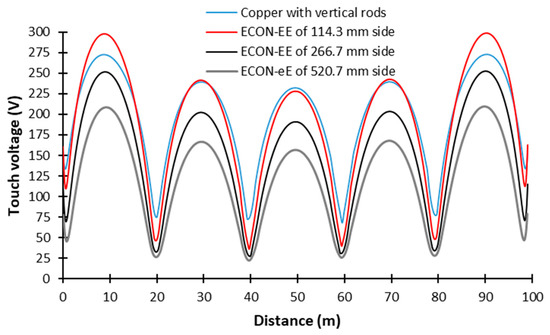 The efficiency of the ECON-EE grounding is also illustrated in Figure 8, presenting the evolution of the distribution of the touch voltage along the grid diagonal (Figure 1a) as a function of the square geometry with side length a, which is compared with the distribution obtained for the copper grid with vertical rods. The results obtained show that the maximum values of the touch voltage decrease with the increase in the ECON-EE area (or side a).