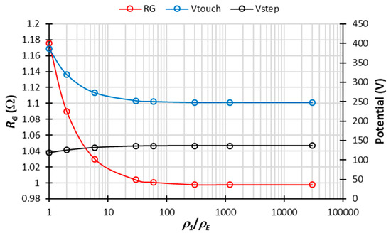 In this section, the influence of the electrical resistivity ρE of the ECON is investigated for an ECON-EE square section with a side length a of 266.7 mm leading to a grounding resistance value of 1.001 Ω, as presented in Table 4. Table 6 presents the results obtained for different values of ρE and its influence on the grounding system parameters. Figure 9 presents the evolution of RG and the touch and step voltages plotted as a function of the ratio ρ1/ρE, where ρ1 = 300 Ω-m is the resistivity of the first soil layer and ρE the resistivity of the ECON-EE. From the results obtained, it can be observed that the grounding resistance and the touch voltage decrease by 14.88% and 35.31%, respectively, when the ECON resistivity ρE decreases from 300 to 5 Ω-m, corresponding to a ρ1/ρE ratio increase from 1 to 60. After this, both the grounding resistance and the touch voltage remain constant as the ECON resistivity decreases or the ratio of ρ1/ρE increases. Such behavior of the grounding resistance is consistent with the results reported in [13,31] in the case of a simple vertical rod embedded in a cylinder of ordinary concrete [13] or GEM [31]. It is also interesting to note that the step voltage follows the opposite trend to the touch voltage, with an increase until a ρ1/ρE value of 60, followed by a constant value for higher ECON resistivities.