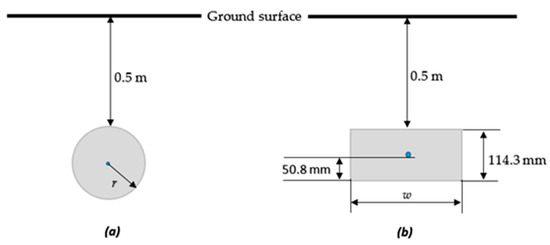 In this section, the influence of the ECON section geometry is investigated. For this, two section geometries were studied, a circular section (Figure 10a) and a rectangular section (Figure 10b), with the same encased rebar electrode of 12.7 mm diameter used in the previous section and centered in the middle. The simulation parameters were the same as used in the previous section, and the distance between the ground surface and the top of the ECON-EE system was maintained at 0.5 m. In addition, as for the square section, the height of the rectangular section was fixed at 114.3 mm, which is the minimum side dimension of the square section in order to maintain the minimum required ECON thickness between the rebar and the ground at 50.8 mm (see Figure 10a), as required by [15].