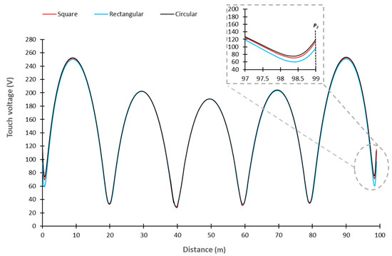 In the same way, the results in Table 7 and Table 8 have demonstrated that the geometry of the ECON section has no real influence on the grounding system parameters as long as the section area is the same. When the section area is kept constant for different section geometries, the RG and the touch voltages are similar. The only difference observed was in the step voltage, with a difference of 2.22% lower and 5.67% higher for the circular and rectangular sections, respectively, compared to the square one. Although not very significant, this difference can be explained by the apparent surface of the ECON-EE section, which is greater and lower for the rectangular and circular sections, respectively, than that of the square section. The apparent section seems to have a small influence on the distribution of the potential at the surface of the ground in the vicinity of P2, where the step voltage is determined (see Figure 1a). This influence can be observed in Figure 11 and particularly in the magnified section of the end of the touch potential distribution. As can be observed, the touch voltage at P2 is lower and higher for the rectangular and circular sections, respectively, compared to the square section. In this condition, the potential difference calculated between points P2 and P3 becomes higher for the rectangular section and lower for the circular one, and this explains the difference obtained in the step voltage for each section.