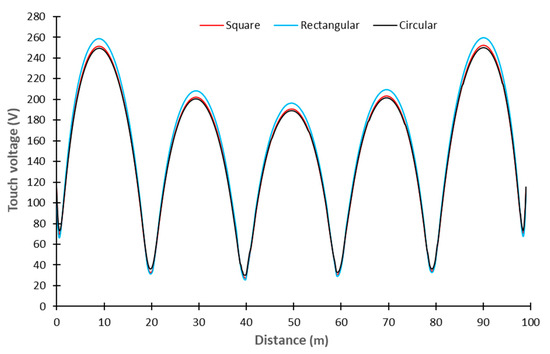 Figure 12 presents the evolution of the touch voltage along the grid diagonal obtained for the three sections. As can be observed, the larger difference between the touch voltage of the rectangular section and the square one is obtained for the maximum value of the touch voltage distribution obtained close to the center of each grid mesh.