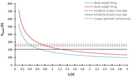 Figure 13. Distribution of the allowable touch voltage as function of the duration of the current fault event obtained for body weights of 50 kg and 70 kg and for a ground resistivity of 300 Ω-m and Cs = 1.