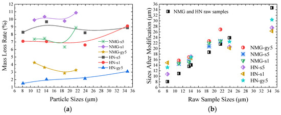 Variations in the mass and particle sizes after modification. (a) Mass variation. (b) Particle sizes variation.
