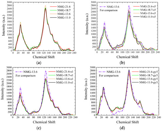 The chemical shifts between 164 and 188 ppm mainly represent carboxyl groups [26]. In Figure 3d, the signal intensity of these parts does not change as the particle sizes decrease; however, the overall signal intensity of the HN–gy5 aromatic peak 90–160 ppm declines as there is a reduction in the particle sizes. This indicates that the ratio of the carboxyl group to the overall carbon structure increases, which is consistent with the conclusions made from the NMG groups.