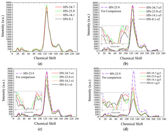 The 13C-NMR spectra of HN raw and modified samples are exhibited in Figure 3. For comparison and analysis, the 13C-NMR spectra of HN–23.9 are added into Figure 3b–d. As a high-rank coal, the aromaticity of HN samples is relatively high; therefore, there is an evident peak in all the spectra. The signal intensity of aromatic peaks shows a downward trend in all three kinds of modified samples. With the decrease in the particle sizes, the intensity of the aromatic signal drops gradually. Compared with bituminous coal, more condensation rings and less side chains exist in anthracite coal. Additionally, the most common bridge bonds in anthracite coal are ether bonds [26], which are liable to be oxidized and broken [21,25]. With reducing particle sizes, the reaction area between the coal and reagent increases. Hence, the reaction degree deepens, which leads to the disintegration of a more aromatic nucleus and a weaker signal intensity.