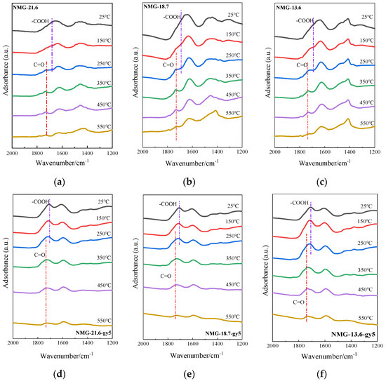 A part of the FTIR spectra of the NMG raw samples are demonstrated in Figure 4. Carboxyl functional groups are in the position around 1700 cm−1, C=C in aromatic ring is around 1600 cm−1, and 1733–1772 cm−1 represents C=O in esters [28,29]. Compared with the raw samples, the peaks of the carboxyl groups in NMG–gy samples are more evident. Carboxyl functional groups will decompose into CO2 and H2O around 200 °C [17]. Therefore, the spectral intensity around 1700 cm−1 drops promptly between 150 and 250 °C.