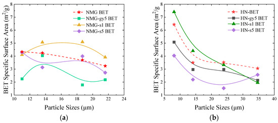 The BET specific area of all the raw and modified samples versus the particle sizes is depicted in Figure 5. The values of the BET specific surface area are connected in a line to reflect the trend of the change. In Figure 5a,b, the specific area of NMG and HN raw samples increases as the particle sizes decrease. The mesoscopic properties of raw samples are altered slightly by the chemical modification. Compared to raw samples, the specific surface areas of both NMG–s1 and HN–s1 rise slightly. Some covalent bonds in the coal matrix are oxidized and fractured in 1 wt% H2O2 solution. Due to the removal of cross-linked bridge bonds and functional groups, the pores inside the coal may be further extended and developed. As a result, the specific surface areas develop generally.