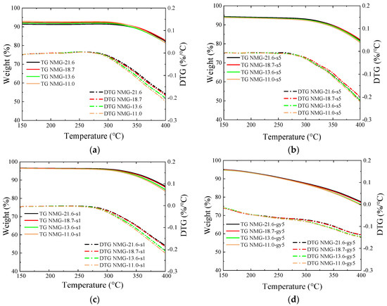 TG-DTG curves of NMG raw and chemically modified samples. (a) NMG raw samples. (b) NMG−s5. (c) NMG−s1. (d) NMG−gy5.